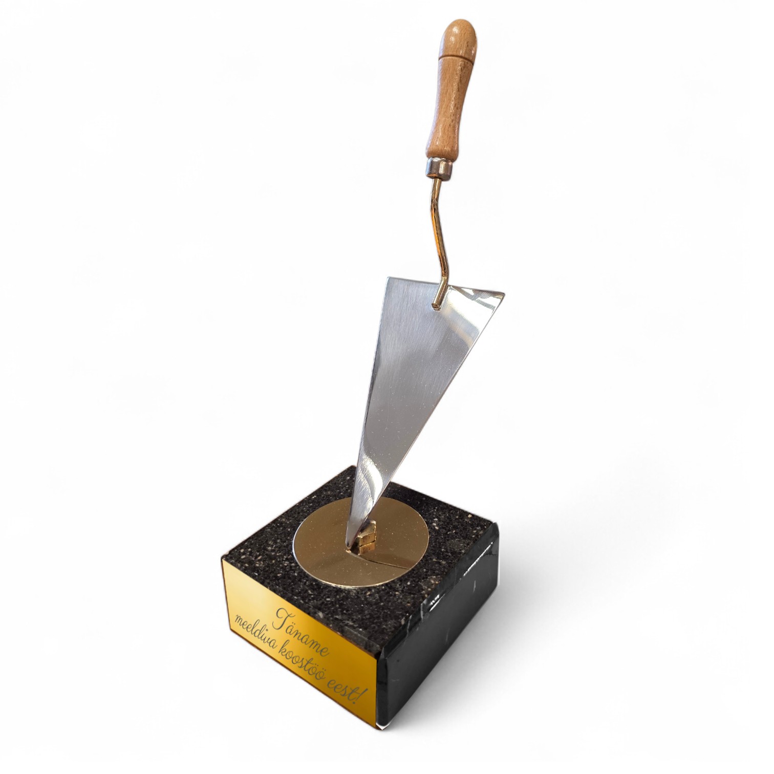 Hõbedane kellu on sobilik kingitus kas ehitajale või muidu tublile töömehele. Graveerplaadile graveerime just teile sobiva teksti, nii on ka auhind personaalne. Sobilik kingitus ka ehitusettevõtetele ja soovi korral graveerime ka logo. Kõrgus 260 mm, kivi alus 85 x 85 x 40 mm.