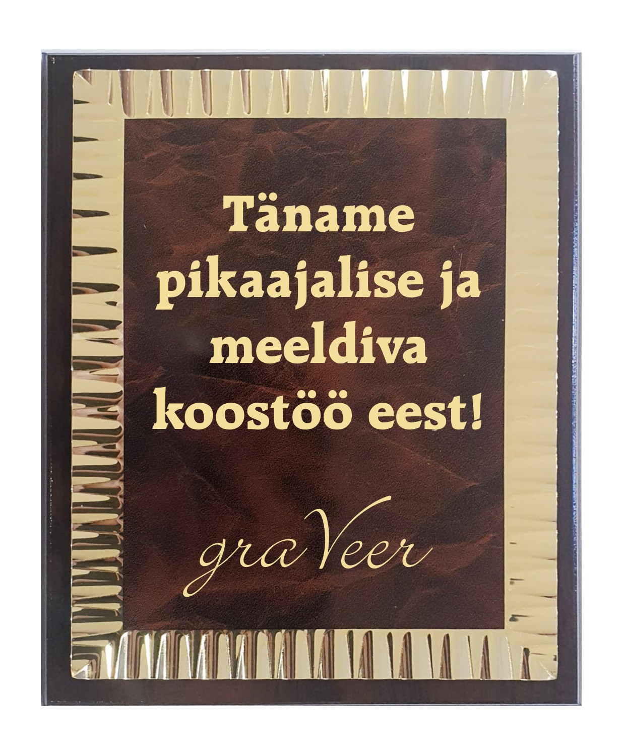 Erilisi inimesi saab tänada erilise tänuplaadiga. Marmormustriga pruun ja kuldse pressitud äärega metallplaat jääb graveerituna väga esinduslik. Kõige paremini sobib see tänuplaadiks, koostööpartneritele, kolleegidele, aasta tegijatele jne. Võimalik graveerida ka logo või mõne muu ornamendiga. Saab graveerida nii portrate kui ka landscape formaadis.