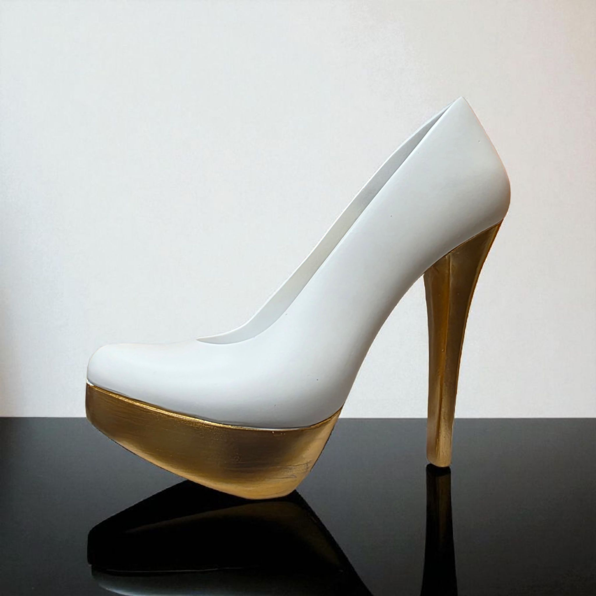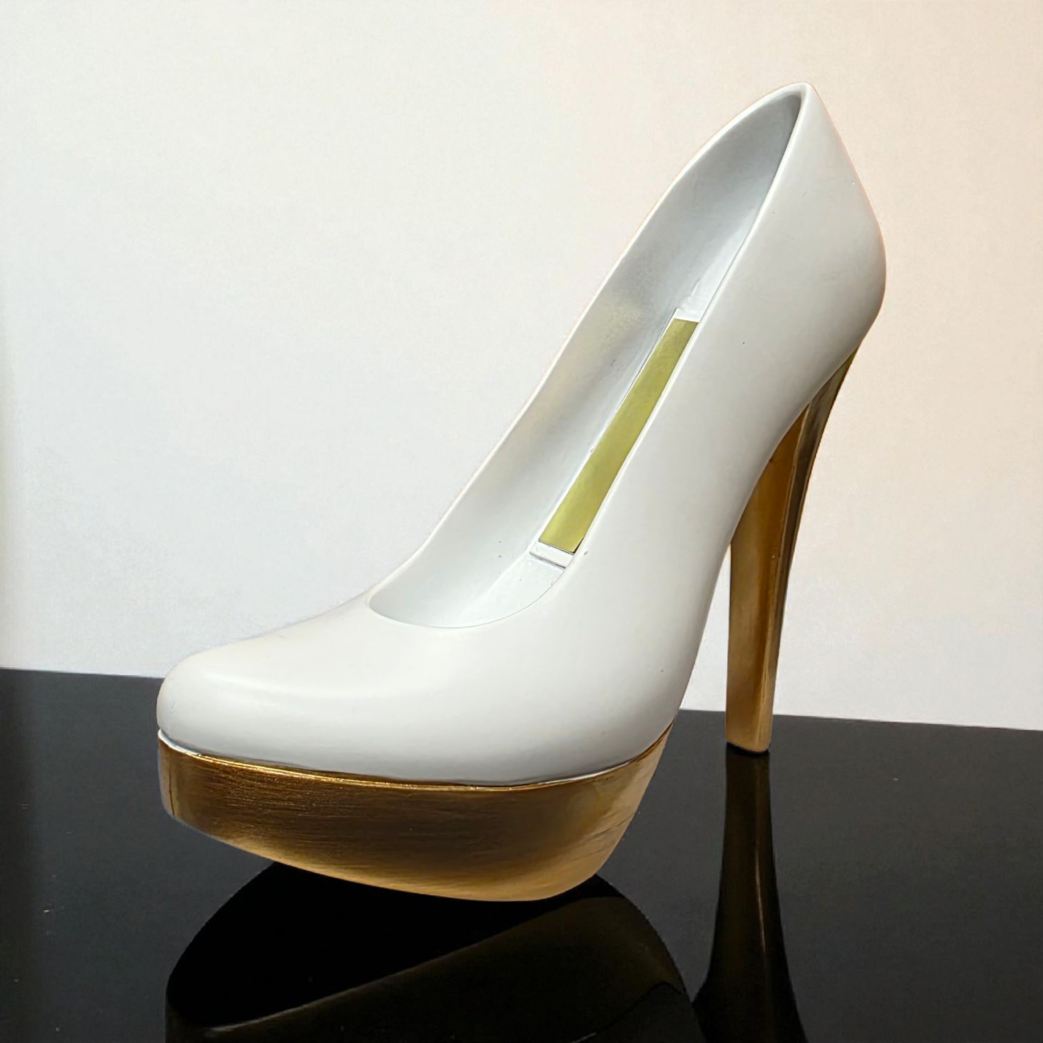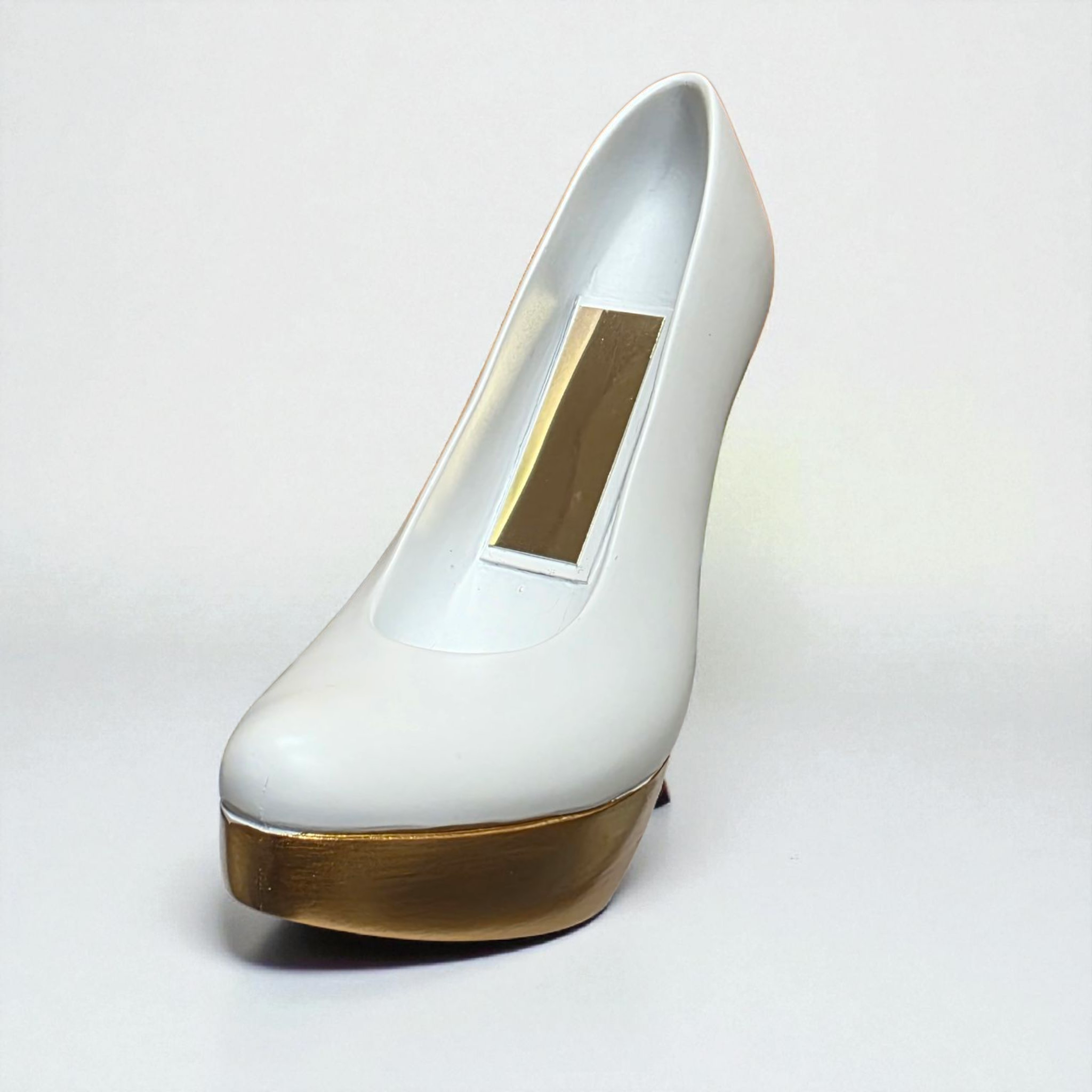 Ilus ja stiilne kingitus naisterahvastele, kuldse kontsaga valge king. Kontsa kõrgus 100 mm 🙂 See on nagu Oskar naistele. Karika kõrgus 160 mm. Graveeritava plaadi mõõt on 65×23 mm. Karikas on piisavalt raske, 700gr. Seda naiselikku karikat võib kinkida einevateks tähtpäevadeks, graveerides sellele just teile sobiva teksti. Nii on karikas personaalne ja rõõmustab selle saajat. Eriti sobilik on kinkimiseks naiskolleegidele, sekretärile või direktrissile. Hind sisaldab karikat koos plaadi graveeringuga.