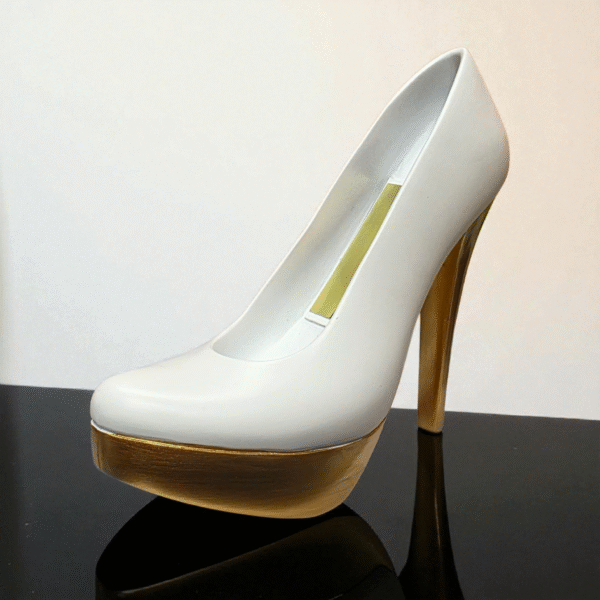 Ilus ja stiilne kingitus naisterahvastele, kuldse kontsaga valge king. Kontsa kõrgus 100 mm 🙂 See on nagu Oskar naistele. Karika kõrgus 160 mm. Graveeritava plaadi mõõt on 65×23 mm. Karikas on piisavalt raske, 700gr.  Seda naiselikku karikat võib kinkida einevateks tähtpäevadeks, graveerides sellele just teile sobiva teksti. Nii on karikas personaalne ja rõõmustab selle saajat. Eriti sobilik on kinkimiseks naiskolleegidele, sekretärile või direktrissile. Hind sisaldab karikat koos plaadi graveeringuga.