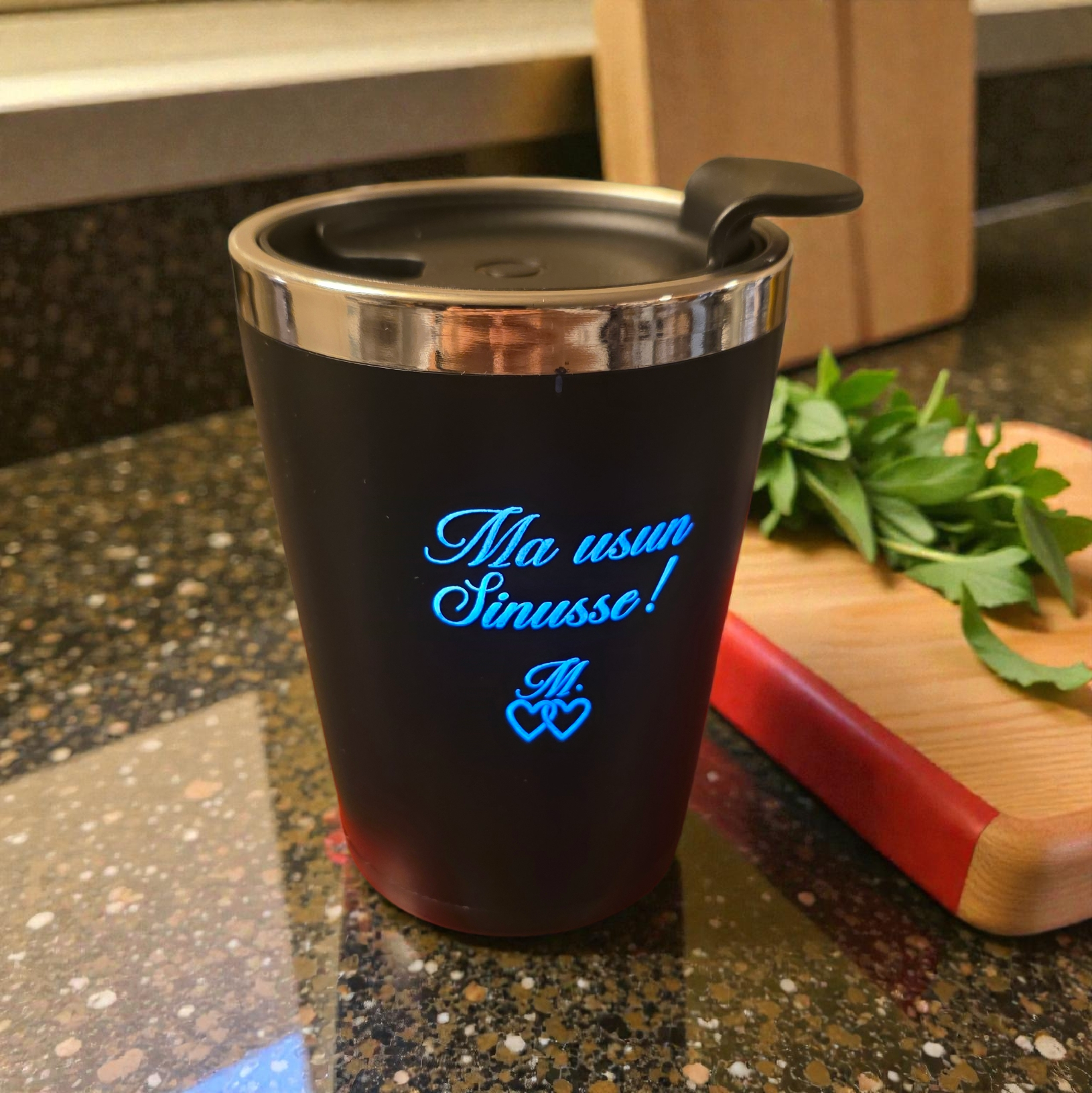 Kas soovite tähelepanu tõmmata? Selle kruusiga on see võimalik. Termokruus reageerib liikumisele – kui tõstate kruusi hakkab tekst või logo põlema ja põleb seni kuni te selle jälle lauale asetate. Kaanel on nii kõrre kui joomisava. Sisu üleni roostevaba. Näidisel olev pirn on graveering mille asemele saab graveerida Teile sobiva teksti või logo.