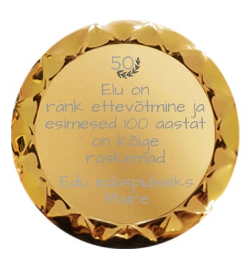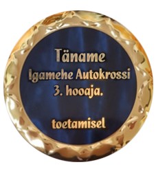 Metallplaadil on ilus kuldne/klombitud äär ja valida saab kas marmormustriga sinise plaadi või kuldse plaadi vahel. Sinisele plaadile saab graveerida foto ja ka teksti aga kuldsele plaadile saab graveerida ainult teksti. Metallplaadi läbimõõt on 180mm, graveeritav osa 140mm.Kaasa tuleb jalg, millega saab plaati asetada riiulile.  Graveerime just teile sobiliku teksti või ka foto, et teha meeldejääv kingitus/ mälestus erinevaks elusündmuseks